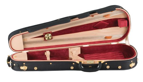 The elegance and features of the Ambassador case in a compact design. The strong wood shell protects your instrument while the elegant gold tone hardware nicely complements the claret red cotton or onyx black velvet interiors with camel accent. Includes plenty of room for your shoulder rest. For 4/4 violin only. Weighs 5.34 lbs.